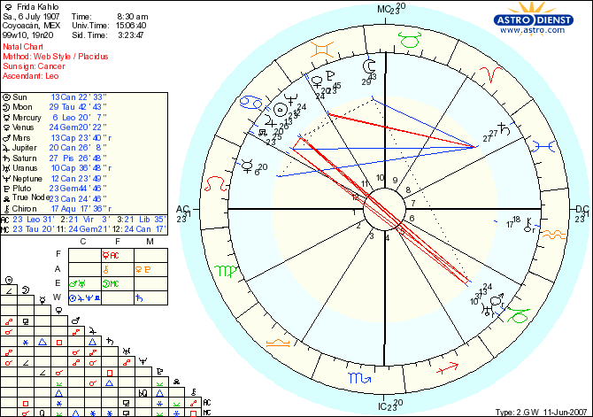 Frida's Ascendant in Leo, which has the heart and circulatory system, as well as the thoracic spine, as its vulnerable areas. Frida's Sun is also her Ascendant Ruler, and is in sensitive, emotional, motherly, Phlegmatic Cancer. Frida's life mission, which she realized so well, was to express her deep feelings and emotions through her paintings; her paintings were her life.