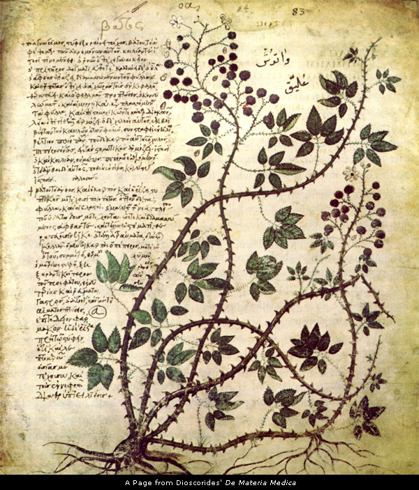 In 70 A.D., Dioscorides published De Materia Medica, or, "On Medicinal Substances" in five volumes. Translated into several languages both ancient and modern, and later supplemented with commentary by European, Middle Eastern, and Indian authors, it has been the prime authority and source work on herbs and other medicinal substances in the history of Western Civilization, and quite possibly in the history of the world.